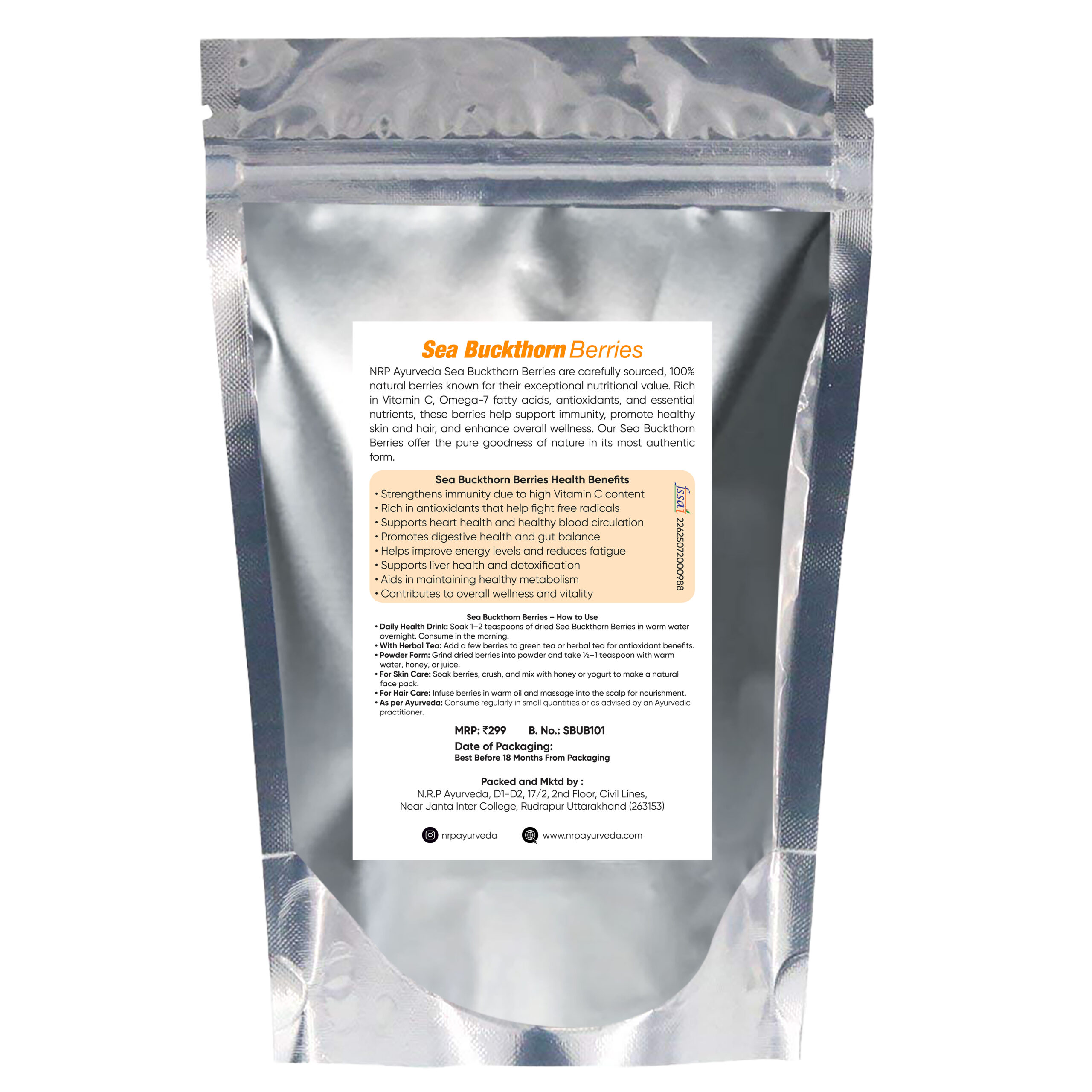 These powerful berries support immunity, skin health, digestion, metabolism, and overall vitality, making them an excellent addition to your daily wellness routine. Free from chemicals, preservatives, and artificial additives, NRP Ayurveda Sea Buckthorn Berries deliver the pure goodness of nature, just as Ayurveda intended.